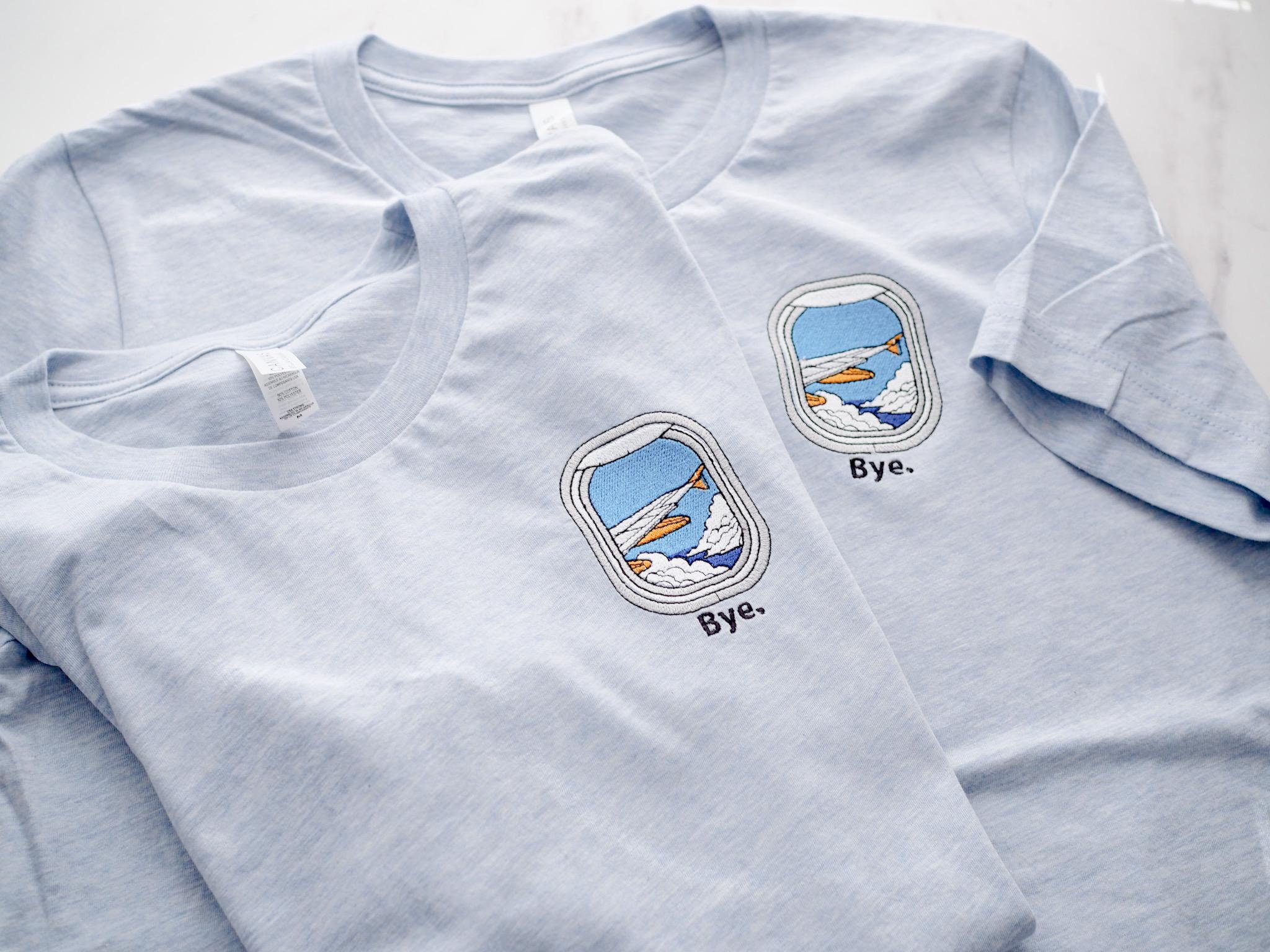 “Bye” tee features an embroidered airplane window view and text on a light blue heather super soft cotton tee.