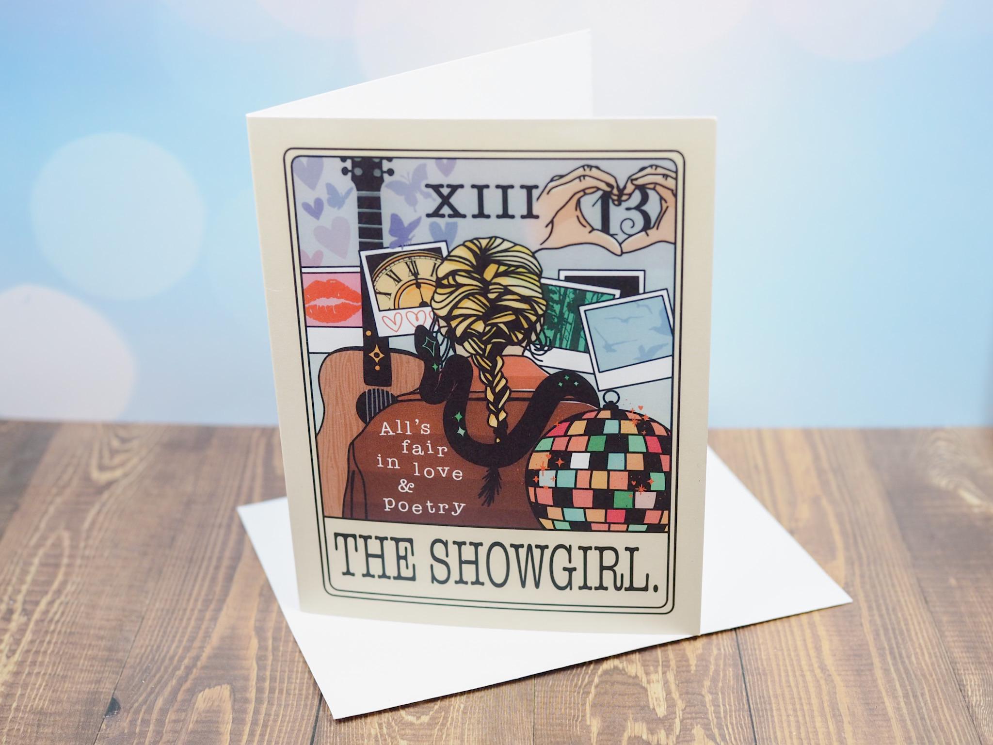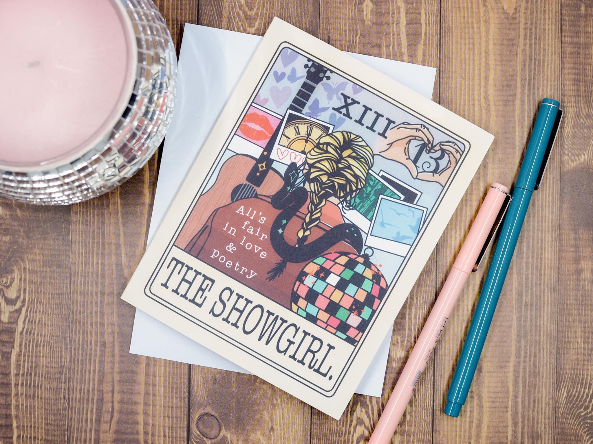 Tags: Taylor Swift greeting card, eras tour card, Swiftie stationery, the showgirl fan art, illustrated music card, poetry greeting card