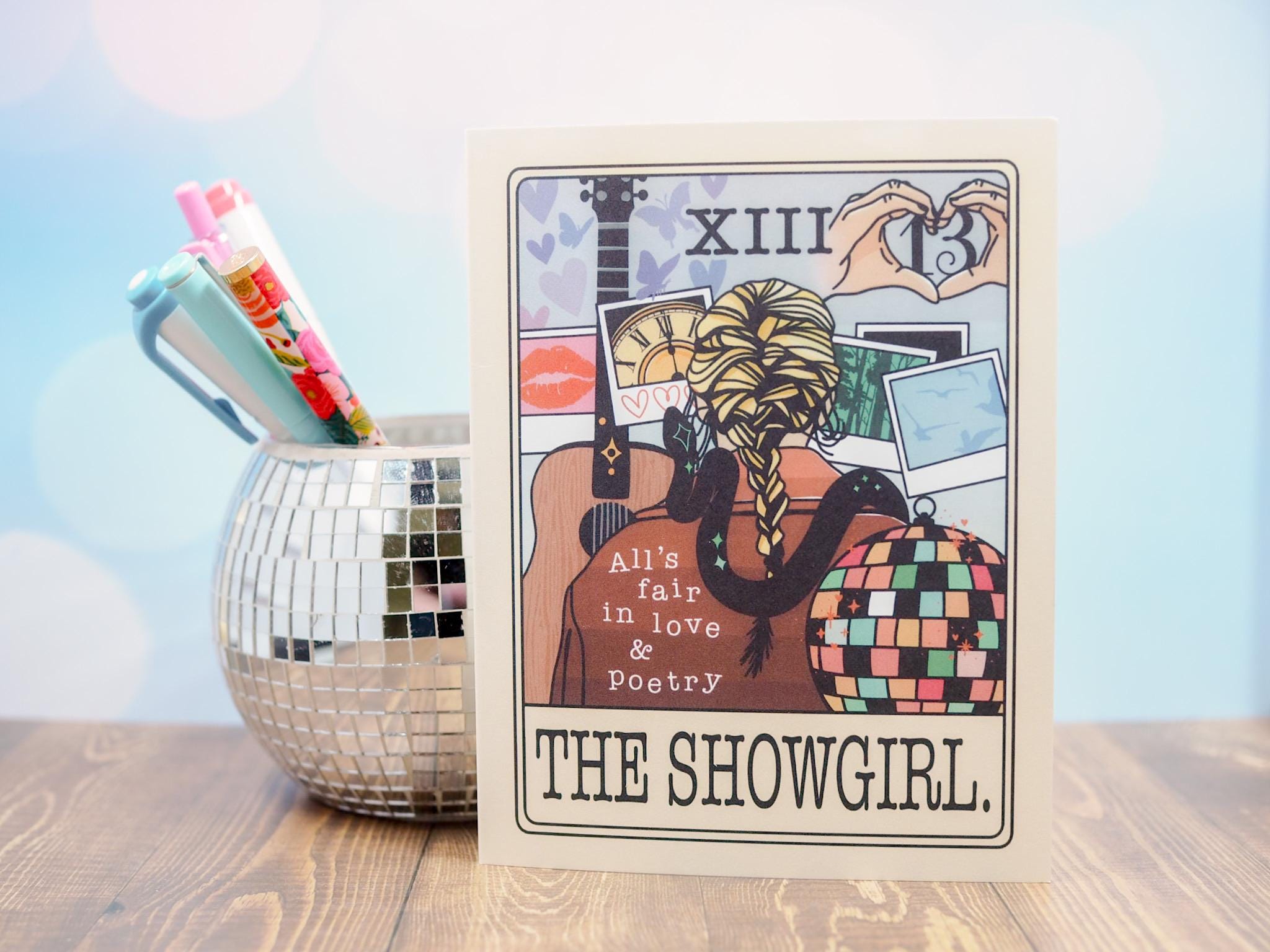 This illustrated greeting card is inspired by Taylor Swift’s The Showgirl aesthetic and makes a perfect keepsake for Swifties. Blank inside for your own message.
