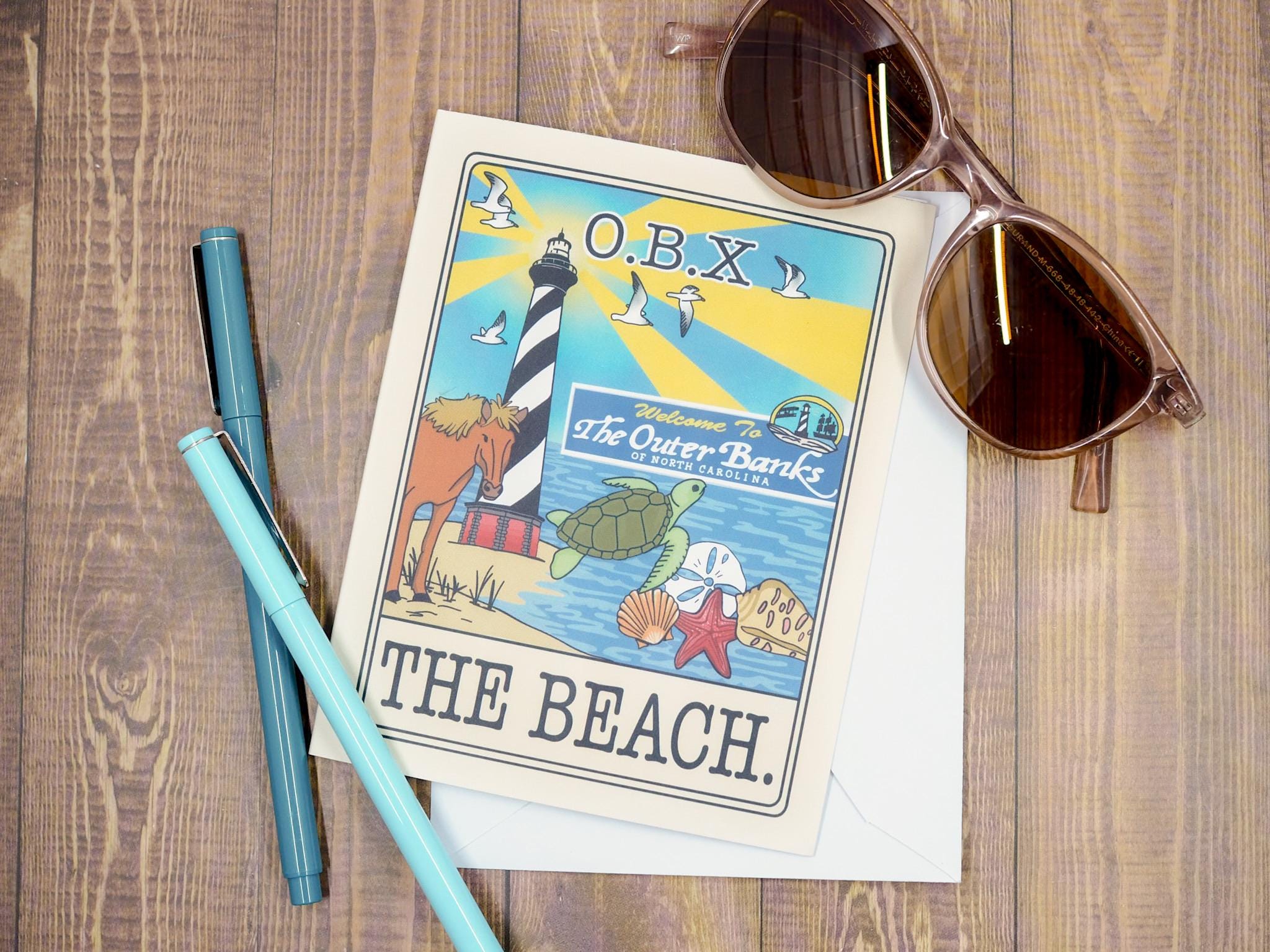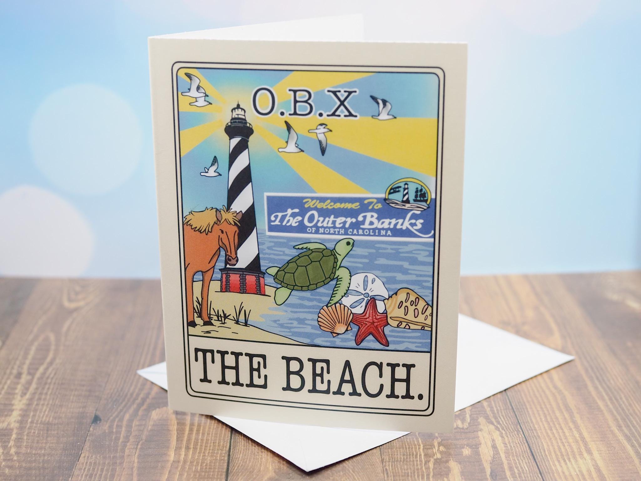 Bring a little coastal charm into your stationery collection! This illustrated OBX card features the iconic Hatteras Lighthouse, wild horses, sea turtles, and beachy details. A perfect card for beach lovers, Outer Banks fans, or as a souvenir.